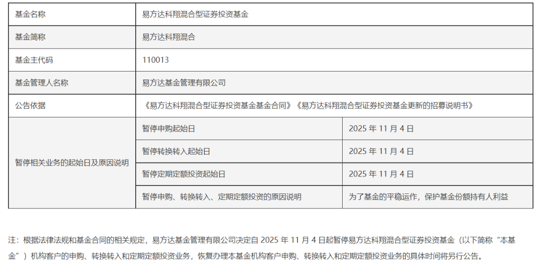 类似的还有,陈皓管理的易方达科翔混合基金自11月4日起暂停机构客户的申购、转换转入和定期定额投资业务。