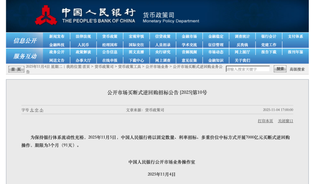 11月4日,央行官网发布消息,为保持银行体系流动性充裕,2025年11月5日,中国人民银行将以固定数量、利率招标、多重价位中标方式开展7000亿元买断式逆回购操作,期限为3个月(91天)。