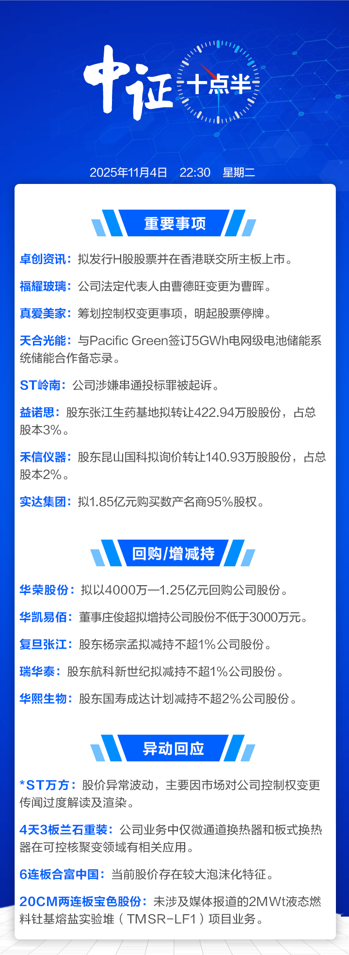 【中证十点半】真爱美家筹划控制权变更;卓创资讯拟赴港上市;6连板合富中国:股价存在较大泡沫化特征