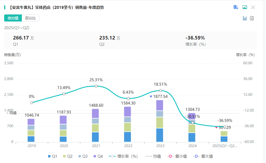 安宫牛黄丸也有类似的表现,该产品在2023年达到销售顶峰,实体药店销售额高达51.44亿元;2024年则降至42.56亿元,同比下降17.24%;2025年上半年进一步下滑至19.14亿元,同比减少16.08%。