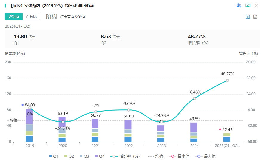阿胶近两年销售情况开始逐年回升。摩熵医药数据显示,2024年阿胶实体药店销售额49.59亿元,同比增幅16.48%,2025年上半年销售额为22.43亿元,同比增加48.27%。