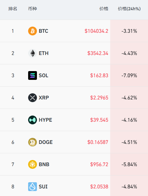 加密货币方面,多个币种大跌,截至23:15,比特币跌超3%,报价104034.2美元/枚,以太坊跌4.43%、BNB跌5.84%、狗狗币跌4.51%,过去24小时,加密货币全网近35万人被爆仓,爆仓总金额约14亿美元。