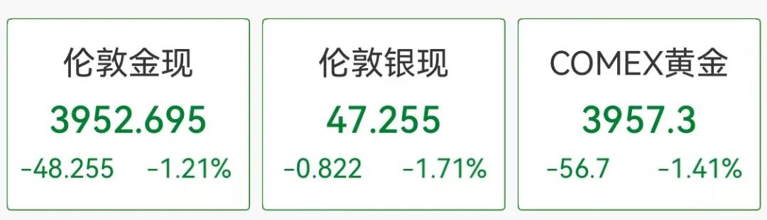 黄金、白银双双下跌,现货黄金一度跌破3930美元,最新跌1.21%,报3952.695美元/盎司,现货白银跌1.71%,报47.255美元/盎司。