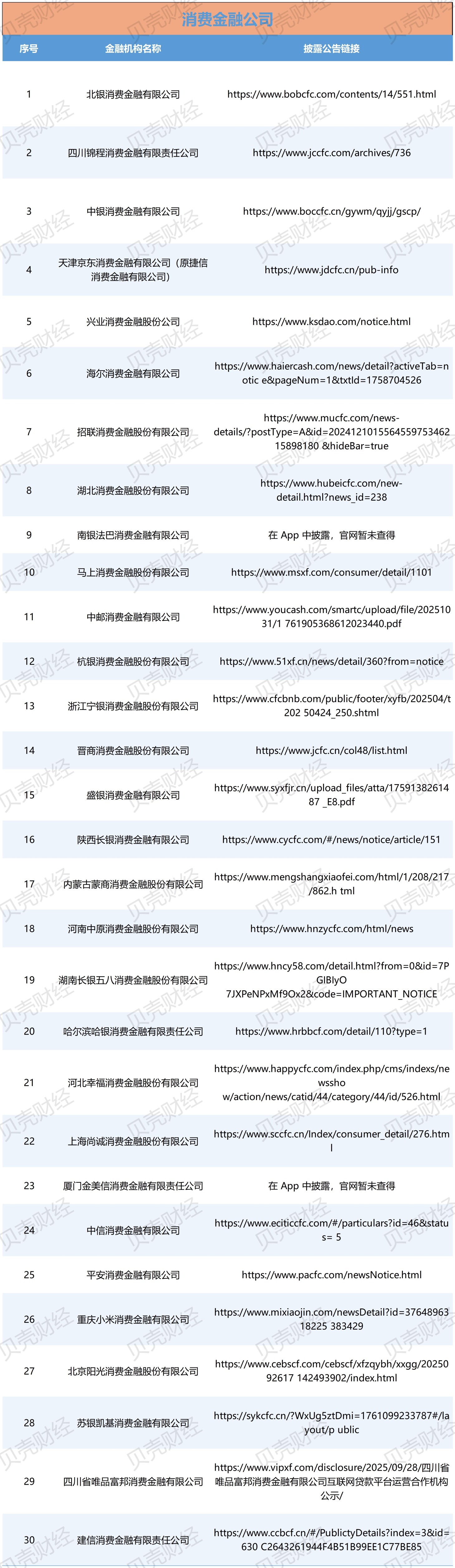 图/30家消费金融公司披露助贷合作机构的链接(新京报贝壳财经记者根据中互金信息制图)