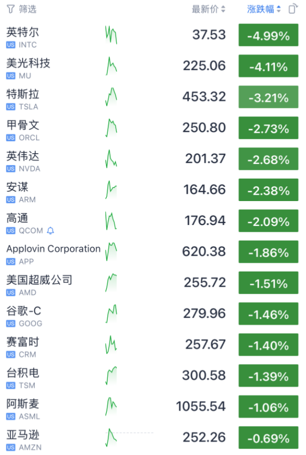 科技股纷纷走低。英特尔跌约5%,英伟达、甲骨文跌近3%。