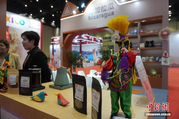 11月3日,河南郑州,尼加拉瓜国家馆展台上摆放着当地特色咖啡粉、手工制品。韩章云摄