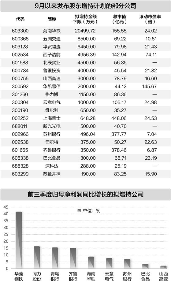 据证券时报·数据宝统计,9月以来共有24家上市公司披露股东增持计划(剔除一致行动人内部转让),发布股东增持计划的上市公司中,19家披露了拟增持金额下限或已增持完毕,合计达到5.99亿元,10家拟增持金额在1000万元及以上,海南华铁、五洲交通、华贸物流拟增持金额下限居前,分别为2.05亿元、8500万元、6450万元。