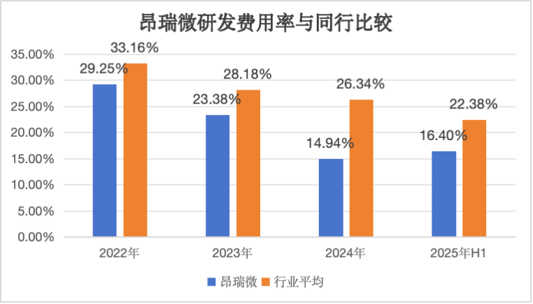 相较于同行可比公司,昂瑞微的研发投入似乎力不从心,今年上半年其研发费用率较行业均值就低了约6%。