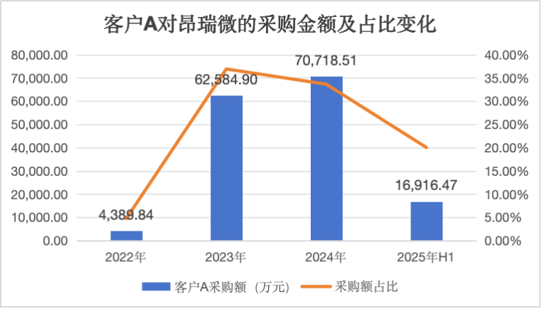 招股书提到,报告期内,客户A(长期为昂瑞微第一大客户)向昂瑞微的采购金额分别为0.44亿元、6.26亿元、7.07亿元以及1.69亿元,占昂瑞微收入比例最高时达到了近四成。