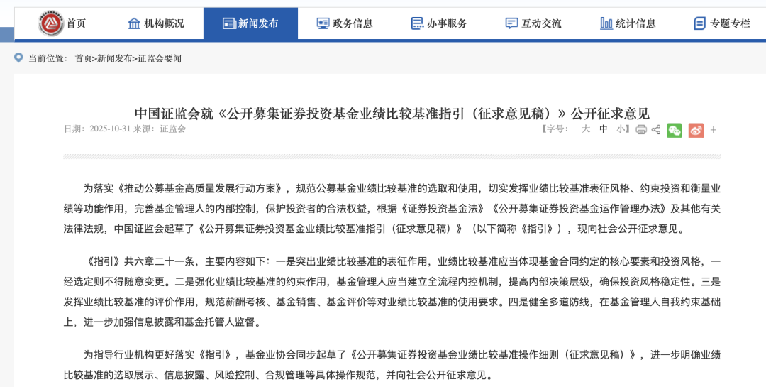 10月31日,证监会发布了《公开募集证券投资基金业绩比较基准指引(征求意见稿)》(下称,《指引》),基金业协会同步发布了《公开募集证券投资基金业绩比较基准操作细则(征求意见稿)》(下称,《细则》),向社会公开征求意见。