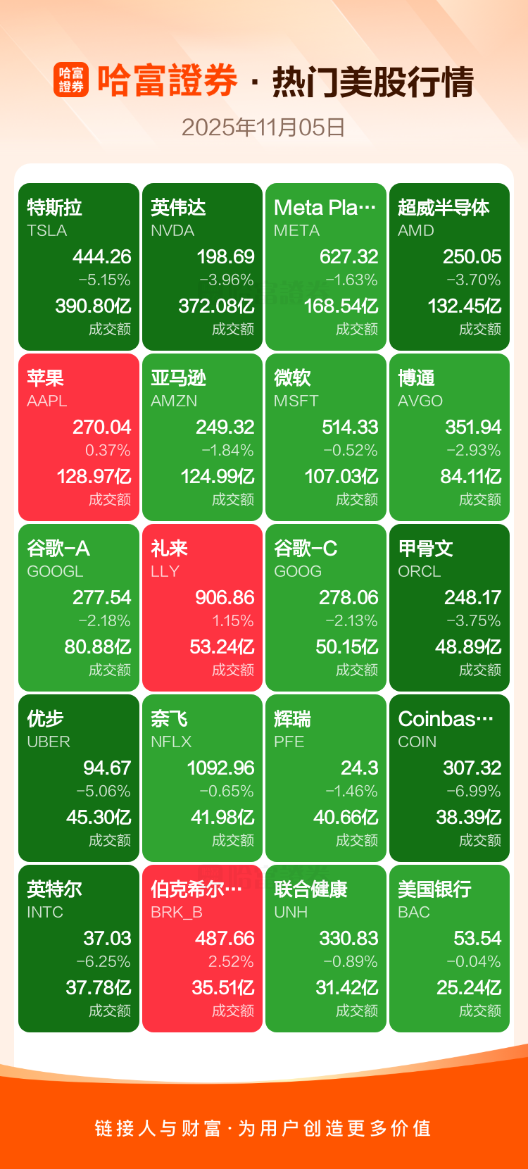 特斯拉跌5.15%,英伟达跌3.96%,Meta Platforms Inc-A跌1.63%,超威半导体跌3.70%,苹果涨0.37%,亚马逊跌1.84%,微软跌0.52%,博通跌2.93%,谷歌-A跌2.18%,礼来涨1.15%。