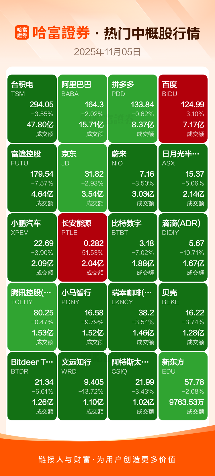 台积电跌3.55%,阿里巴巴跌2.02%,拼多多跌0.62%,百度涨3.10%,富途控股跌7.57%,京东跌2.93%,蔚来跌3.50%,日月光半导体跌5.06%,小鹏汽车跌3.90%,长安能源涨51.53%。