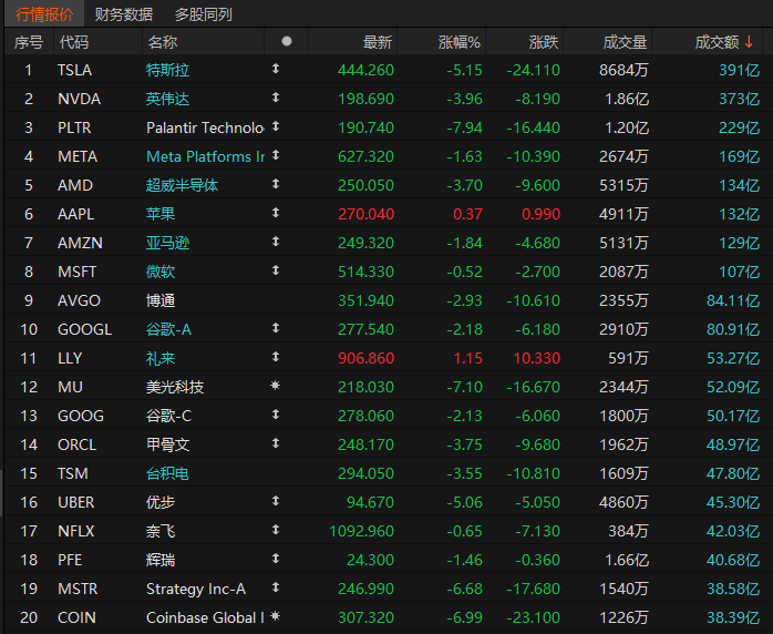 第5名AMD收跌3.70%,成交134亿美元。AMD周三收盘后公布财报:三季度营收92.5亿美元,分析师预期87.4亿美元。三季度资本开支2.58亿美元,预期2.197亿美元。预计四季度营收93亿-99亿美元,分析师预期92.1亿美元。