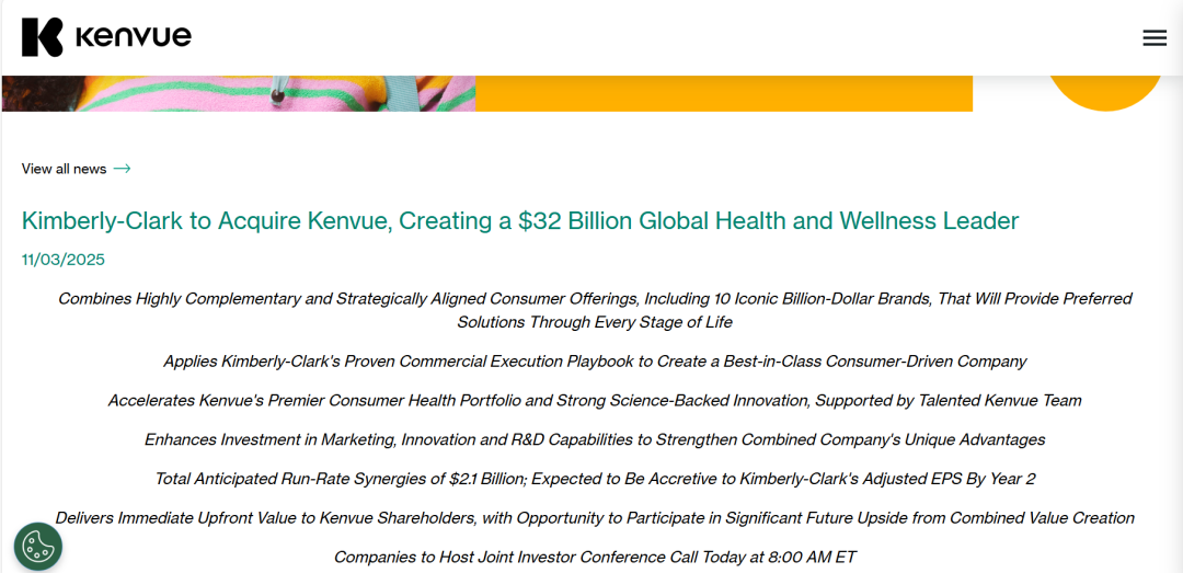 美国东部时间11月3日,美妆巨头Kenvue科赴发布公告,已与全球个人护理巨头金佰利公司(Kimberly-Clark)达成协议,金佰利将通过现金和股票交易的方式收购科赴所有在外流通的普通股。这笔交易将高达487亿美元,是近年来消费品领域最大的交易之一。科赴的官宣消息也直言双方联合预估年营收高达320亿美元,将超越联合利华,成为仅次于宝洁的全球第二大健康和个护产品销售商。