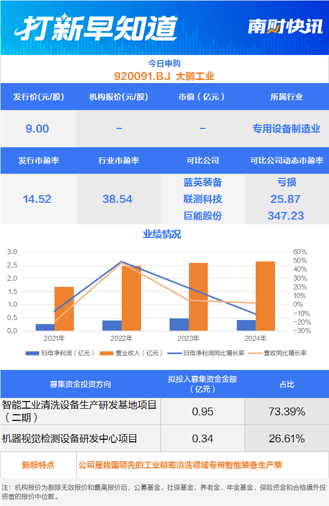 11月5日,有一只新股申购,为北交所的大鹏工业(920091.BJ),另有一只新股上市,为沪市主板的丰倍生物(603334.SH)。