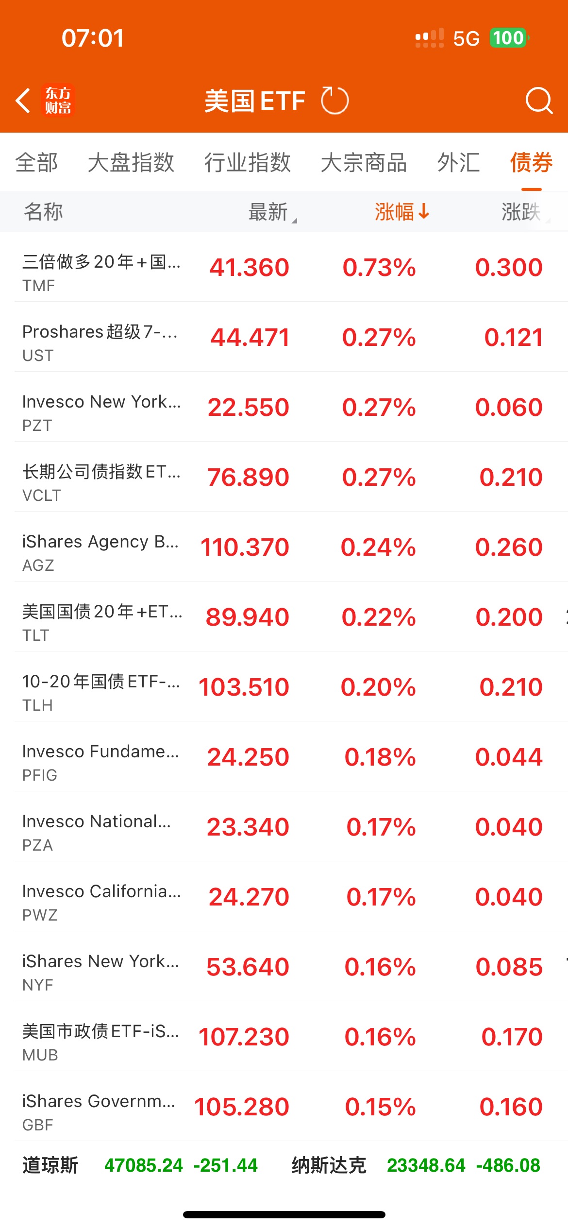 三倍做多20年期以上国债ETF-Direxion(TMF.US) 升0.73%,成交额1.43亿美元。