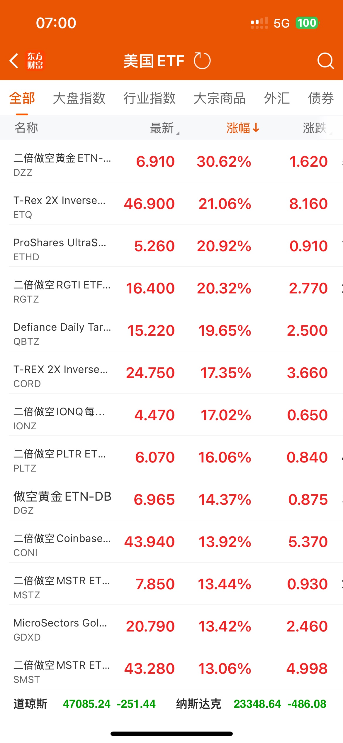 美股ETF升幅榜Top5德银黄金两倍做空ETN(DZZ.US) 升30.62%,成交额410.54万美元。