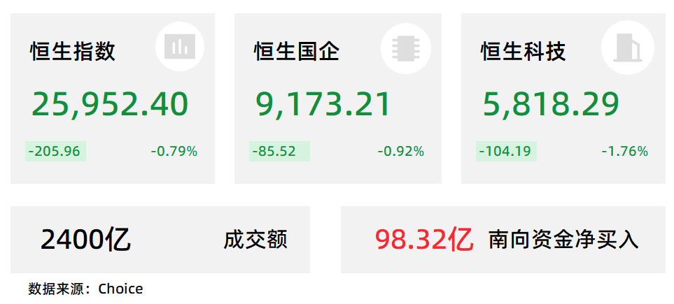 11月4日,港股三大指数午后跳水明显,恒生科技指数一度大跌至3%,最终收跌1.76%,恒生指数、国企指数分别下跌0.79%及0.92%,市场情绪表现十分低迷。