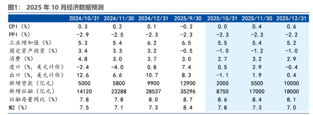 我们预计,10月主要经济指标同比增速可能大多较9月下滑。其中,社零总额在政策拉动减弱、去年基数抬升影响下,同比增速可能进一步下行,固定投资同比降幅或小幅走阔;外需相对平稳,不过去年同期基数大幅抬升,可能拖累同比增速。物价方面,菜篮子价格上涨可能带动CPI同比由负转正,而随着反内卷带来的提振效果消退,PPI环比或再度转负。5000亿元政策性金融工具和新增的5000亿元地方债务对经济的拉动或仍待进一步见效。