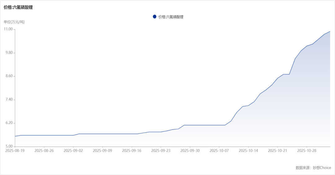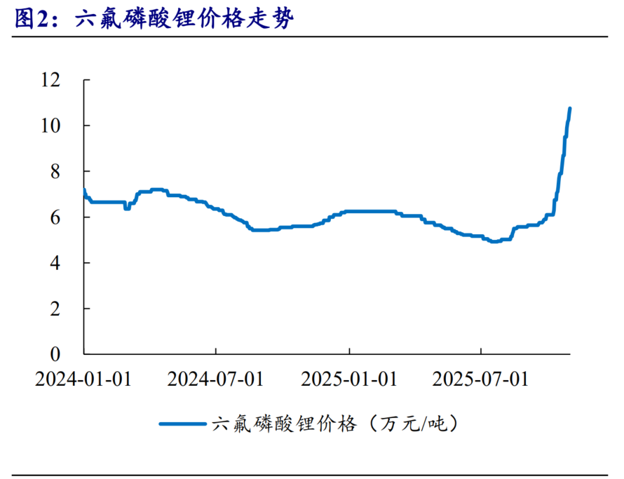 进入2025年,锂电池产业供需矛盾有所缓解,产业链各环节价格出现拐点迹象,部分锂电材料价格开始反弹,进入涨价周期。自9月中旬以来,六氟磷酸锂价格便开启快速上行通道。短期内,市场供应紧平衡状态可能持续至2026年,价格仍有上行空间。我们认为六氟磷酸锂价格的快速上行有可能意味着部分锂电材料的供需矛盾已经得到缓解,并有望迎来涨价周期。