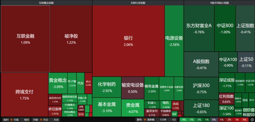 昨日A股三大指数集体回调,沪指跌0.41%,收报3960.19点;深证成指跌1.71%,收报13175.22点;创业板指跌1.96%,收报3134.09点。沪深两市成交额仅有19158亿。行业板块涨少跌多,银行、旅游酒店、铁路公路板块涨幅居前,贵金属、能源金属、电池、电机、风电设备、医疗服务板块跌幅居前。
