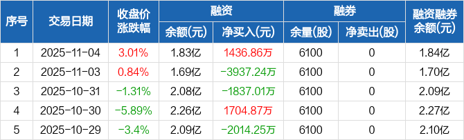 融资方面,当日融资买入8055.97万元,融资偿还6619.11万元,融资净买入1436.86万元。融券方面,融券卖出0股,融券偿还0股,融券余量6100股,融券余额95.68万元。融资融券余额合计1.84亿元。