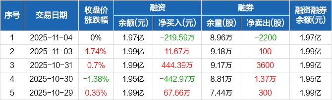 融资方面,当日融资买入535.73万元,融资偿还755.33万元,融资净偿还219.59万元。融券方面,融券卖出300股,融券偿还2500股,融券余量8.96万股,融券余额26.25万元。融资融券余额合计1.97亿元。