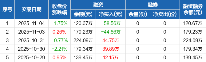 融资方面,当日融资买入178.68万元,融资偿还237.24万元,融资净偿还58.56万元。融券方面,融券卖出0份,融券偿还0份,融券余量0份,融券余额0元。融资融券余额合计120.67万元。