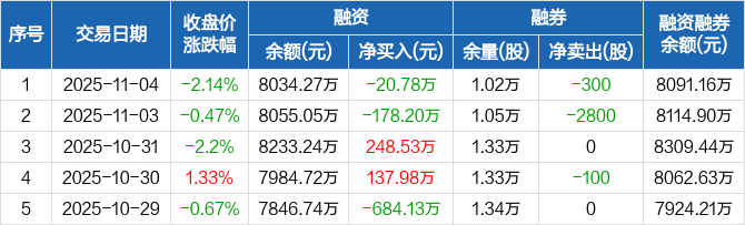 融资方面,当日融资买入307.97万元,融资偿还328.75万元,融资净偿还20.78万元。融券方面,融券卖出100股,融券偿还400股,融券余量1.02万股,融券余额56.9万元。融资融券余额合计8091.16万元。