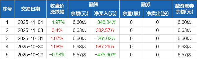 融资方面,当日融资买入1374.4万元,融资偿还1720.43万元,融资净偿还346.04万元。融券方面,融券卖出0股,融券偿还0股,融券余量0股,融券余额0元。融资融券余额合计6.6亿元。