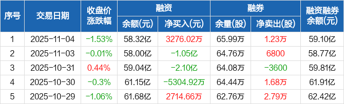 五粮液融资融券信息显示,2025年11月4日融资净买入3276.02万元;融资余额58.32亿元,较前一日增加0.56%。