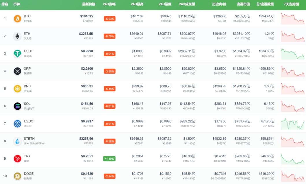 此外,BNB、索拉纳币、STETH等均跌超5%。
