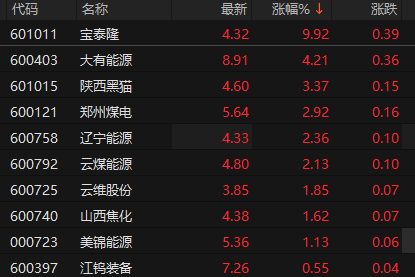 上证报中国证券网讯 11月5日早盘,煤炭板块震荡走高,截至9时37分,宝泰隆涨停,大有能源涨超4%,陕西黑猫涨逾3%,辽宁能源、云煤能源、山西焦化等跟涨。