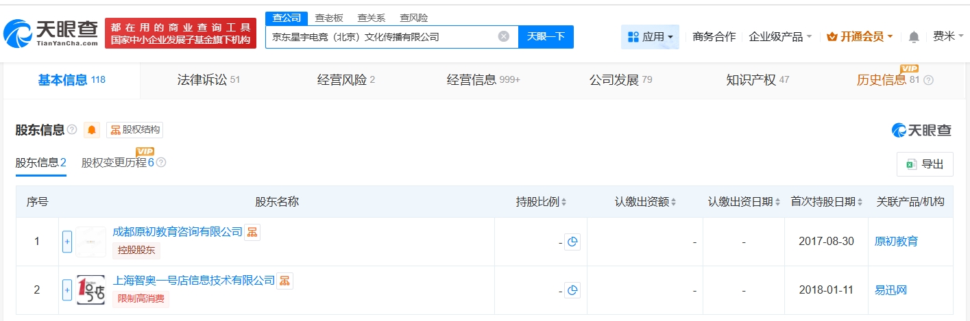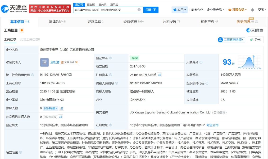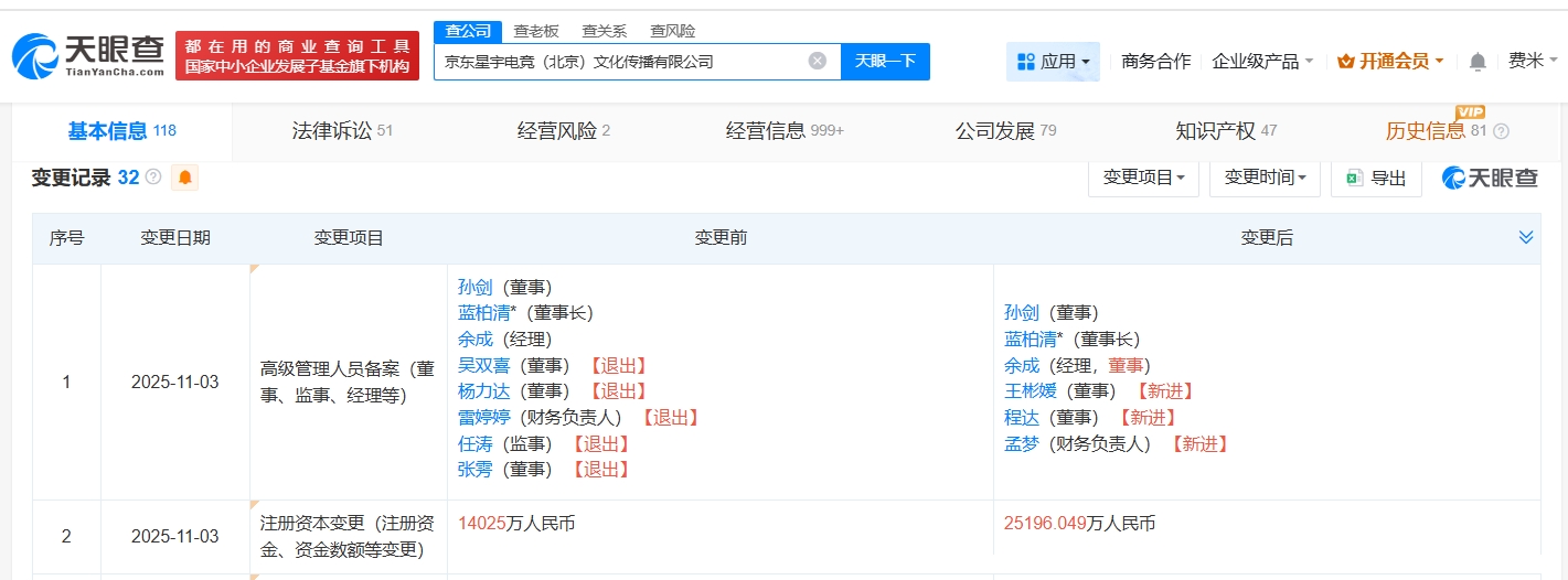 每经AI快讯,天眼查工商信息显示,近日,JDG关联公司京东星宇电竞(北京)文化传播有限公司发生工商变更,注册资本由约1.4亿元人民币增至约2.5亿元人民币,同时多位主要人员发生变更。京东星宇电竞(北京)文化传播有限公司成立于2017年8月,法定代表人为蓝柏清,经营范围包括组织文化艺术交流活动、物业管理、计算机及通讯设备租赁等。股东信息显示,该公司由成都原初教育咨询有限公司、上海智奥一号店信息技术有限公司共同持股。