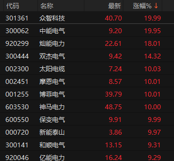 电网设备板块拉升 众智科技、中能电气20cm涨停