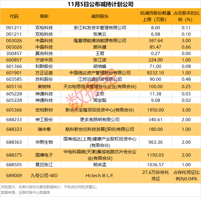 11月5日,16家公司发布了减持计划,拟减持比例居前的有中晶科技、宏柏新材等。从股价表现看,中晶科技(003026)今日低开后,股价跌超7%。