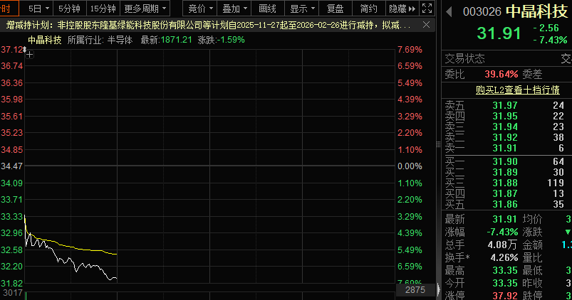 中晶科技持股6.06%的股东隆基绿能计划减持公司股份不超过387.64万股,占公司总股本的3%,董事郭兵健计划减持不超过85.47万股,占公司总股本的0.66%。上述减持主体合计减持公司股份不超3.66%。