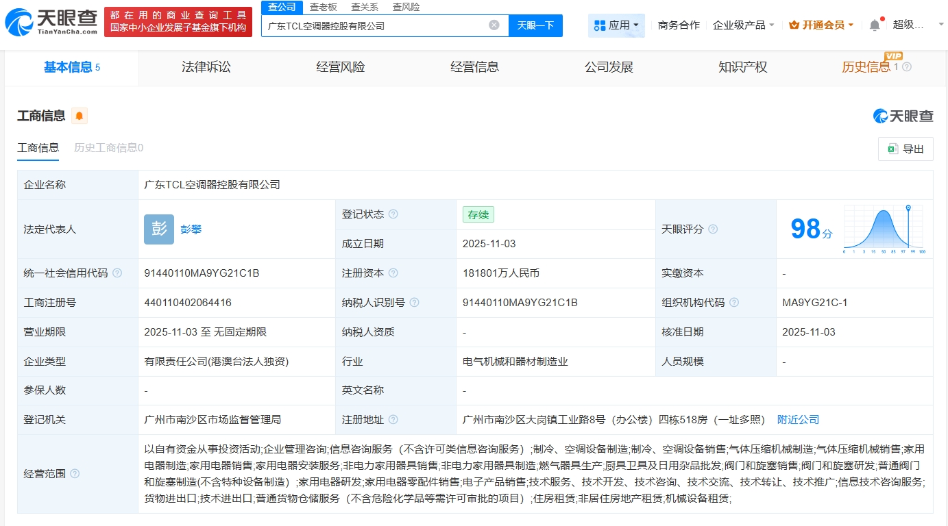 南方财经11月5日电,天眼查工商信息显示,近日,广东TCL空调器控股有限公司成立,法定代表人、董事、经理为彭攀,注册资本约18.18亿人民币,经营范围包括以自有资金从事投资活动、家用电器制造、家用电器研发等。股东信息显示,该公司由TCLAeroWell(HK)HoldingsLimited全资持股。