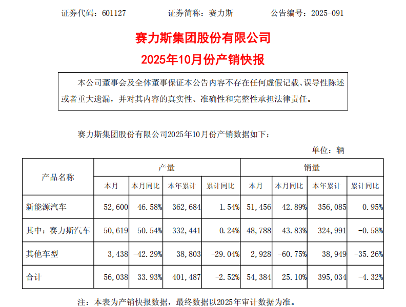 产销快报显示,赛力斯新能源汽车2025年10月销量达5.15万辆,同比增长42.89%;2025年前10月销量达35.61万辆,同比增长0.95%。
