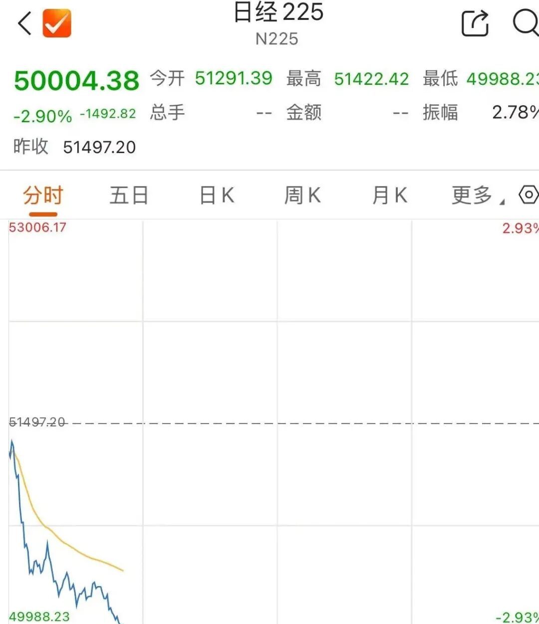 日经225指数同样大跌,周三早盘一度跌超2.9%,两日累计跌幅超4%,截至发稿,报50004.38。