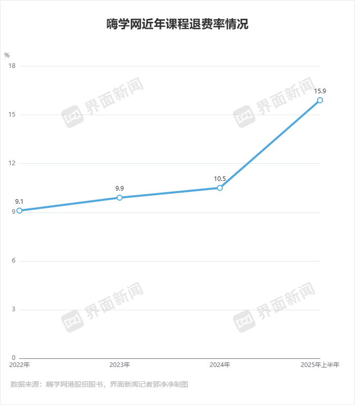 嗨学网近六成收入来自建筑培训业务。招股书显示,2022年、2023年、2024年及2025年上半年,该业务收入占公司总收入比例分别为68.2%、61.5%、59.3%及59.8%。“预期该等课程的收入在可见的未来将继续为我们的收入作出重大贡献。”嗨学网称。