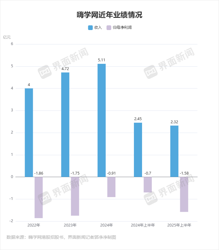 2022年、2023年、2024年和2025年1-6月(报告期内),嗨学网实现收入分别约4亿、4.72亿、5.11亿、2.32亿元,毛利率分别为78.6%、81.1%、81.6%、85.8%,净亏损约1.86亿、1.75亿、9070万、1.58亿元,三年半累计亏损超6亿元。