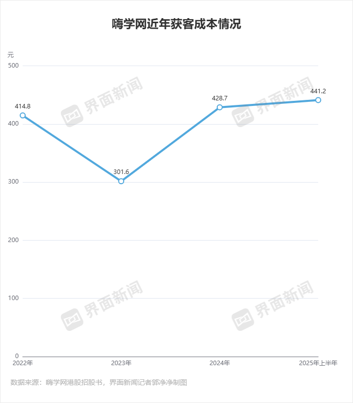 尽管嗨学网称其平均营销投资回报率在2024年达到约8.9%,“位于行业领先水平”。但其获客成本居高不下,报告期内分别是414.8元、301.6元、428.7元及441.2元。