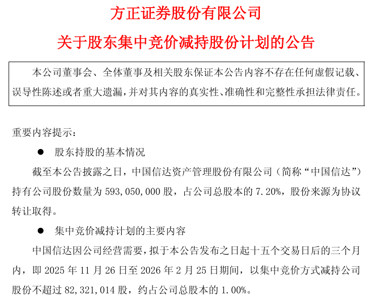 11月4日,方正证券公告称,公司股东中国信达因经营需要,拟于2025年11月26日至2026年2月25日期间,通过集中竞价方式减持其持有的公司股份不超过8232.1万股,约占公司总股本的1%。