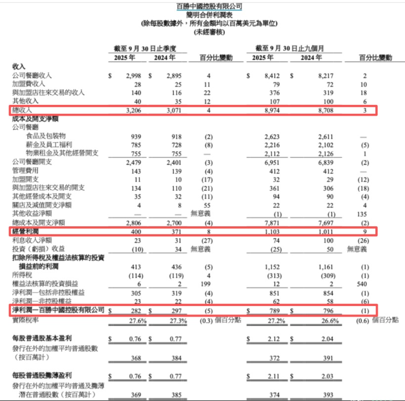 11月4日晚间,肯德基和必胜客中国内地连锁店运营商百胜中国(9987.HK,NYSE:YUMC)发布2025年第三季度报告。第三季度百胜中国总收入同比增长4%至32.06亿美元;经营利润录得4亿美元,同比增长8%;归母净利润为2.82亿美元,同比下滑5%。前三季度百胜中国总收入同比增长3%至89.74亿美元;经营利润录得11.03亿美元,同比增长9%;归母净利润为7.89亿美元,同比下滑1%。
