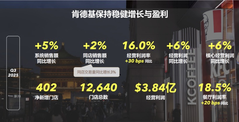 整体来看,第三季度百胜中国门店扩张加速,净新增门店536家,前九个月净新增门店1119家,其中净新增加盟店占比分别为32%和29%。截至2025年9月30日,门店总数达17514家,其中肯德基门店总数达12640家,必胜客门店总数达4022家。其中,第三季度肯德基净新增门店创历史同期新高,加盟店净新增163家,占比41%。