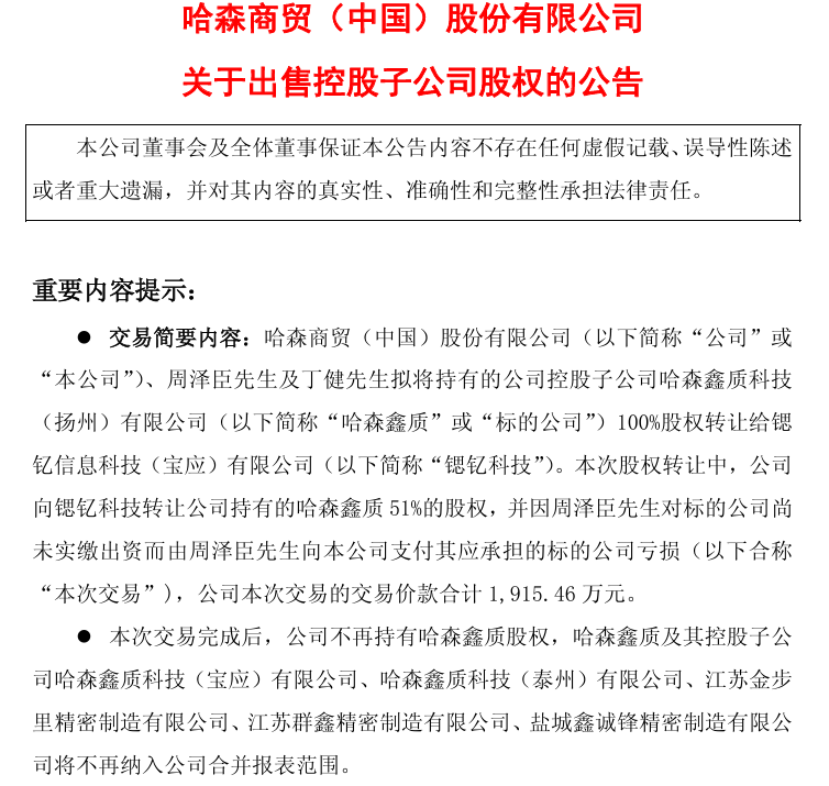 本次交易完成后,公司不再持有哈森鑫质股权,哈森鑫质及其多家控股子公司将不再纳入公司合并报表范围。