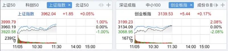 11月5日,A股三大指数早盘低开高走,截至午间休市,沪指涨0.05%,深证成指跌0.15%,创业板指涨0.17%。盘面上,海南自贸区、电网设备板块集体走强,半导体、量子科技板块跌幅居前。