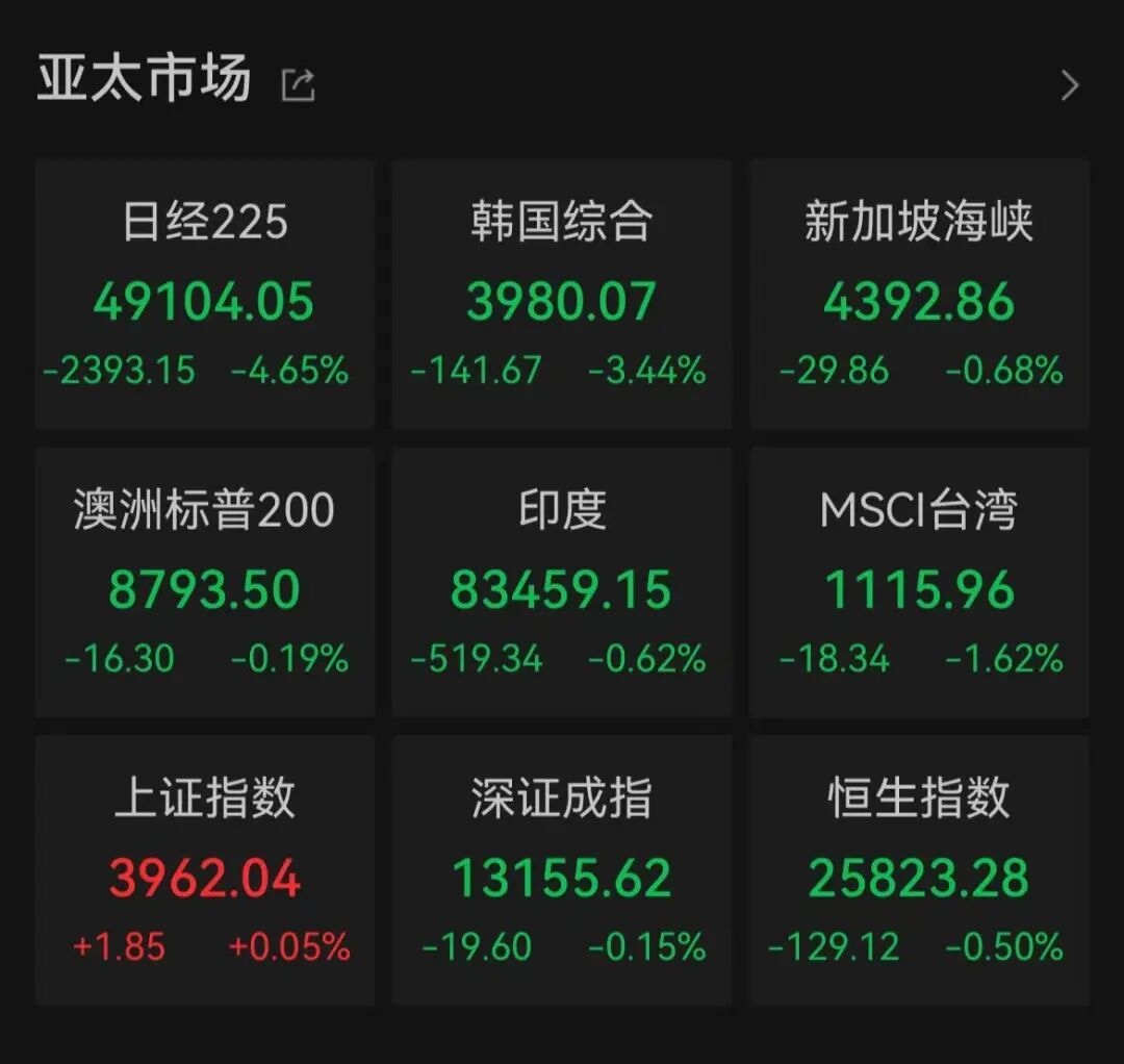 今日A股早盘的调整是亚太股市集体大跌的一个缩影。周三上午,此前涨势如虹的日韩股市突然崩盘,A股、港股悉数低开。其中,韩国KOSPI指数一度大跌超5%,日经225指数大跌超4%。截至A股午间休市,上证指数和创业板指翻红,成为亚太市场为数不多飘红的指数。