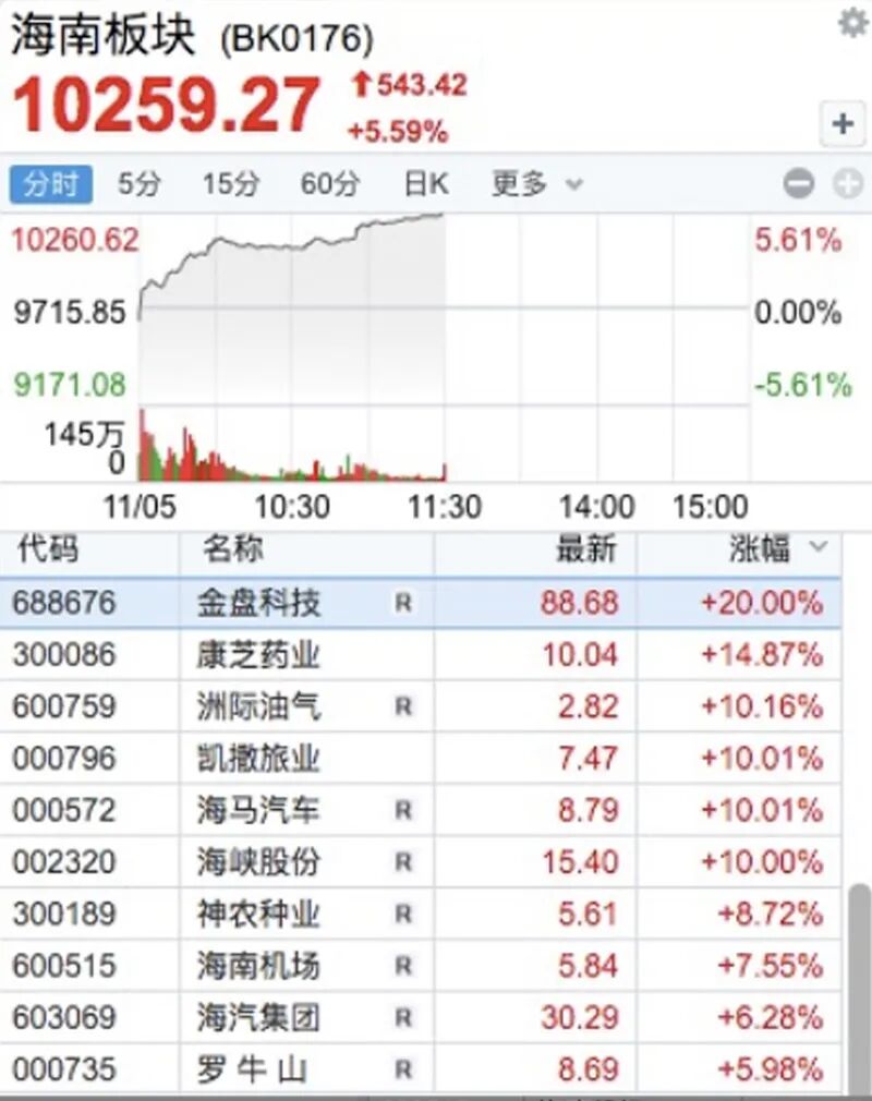 11月5日上午,A股市场海南板块逆势上涨,其中,金盘科技、洲际油气、凯撒旅业、海峡股份涨停;海马汽车开盘1分钟强势涨停,走出4连板;康芝药业涨超10%,神农种业、海南机场、海汽集团等纷纷活跃。